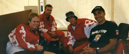 Cindy Klassen (left)- 6-time Olympic medalist, 2 Golds- in long track speed skating- represented Canada at the 1998 World Roller Speed Skating Championships in Spain and at the 1999 Pan American Games in Winnipeg. Included in this photo are Sean Clark, Benoit Vaillantcourt, and Claude Bolduc (coach)- photo from Claude Bolduc